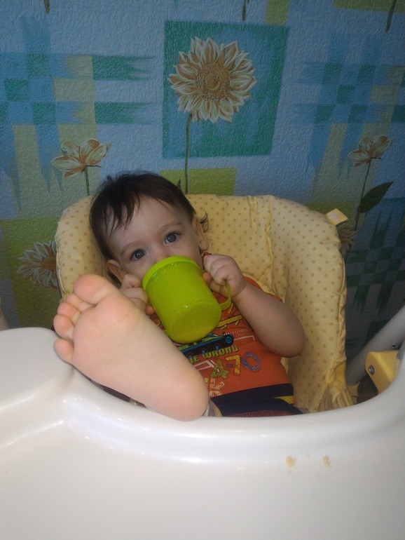 Еда.Из-за болезни похудел мой малек и нового ничего не ввела. Кашу по утрам варю сама на молоке, почти не мельчу. Суп на обед тоже. Жует бананы, хлеб, обожает йогурт, трясется как поильник видит