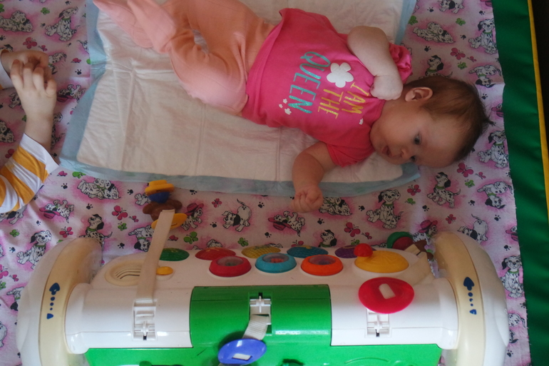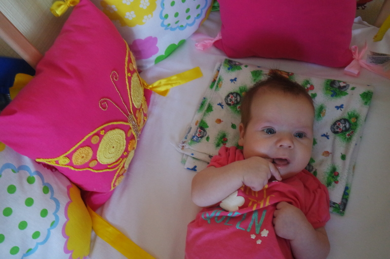 Люда засыпает сама на груди или в кроватке. Кушает только грудь, бутылку с водой не берет.