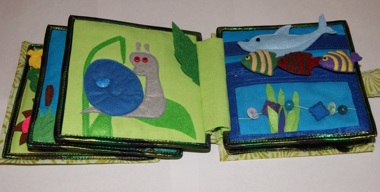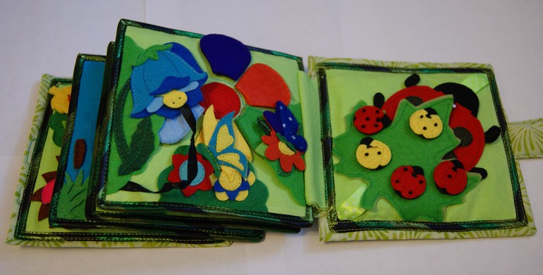 8 страница: под кленовым листом божья коровка (движется по атласной ленте. Коровка на молнии. внутри нее скрываются 5 маленьких божьих коровок на липучке. Пятна у мамы на спине и на кленовом листе - липучка. Нужно сначала вытащить маму из-под листа, открыть карман, достать малышей и разместить их как приспичит.