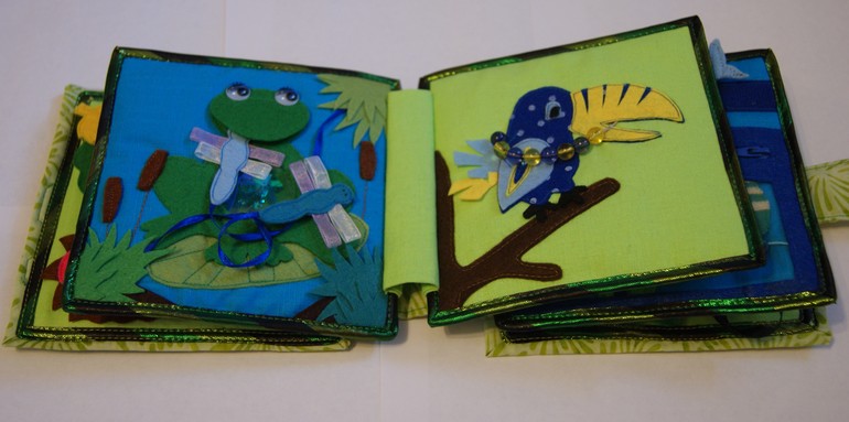 3 страница:лягушка. На листе кувшинки сидит лягушонок и ловит стрекоз. Стрекозы прячутся в зарослях травы. Нужно найти их и накормить лягушонка. Брюшко у лягушки прозрачное, под пленкой бабочки-пайетки. (стрекозы были тщательно обсосаны)