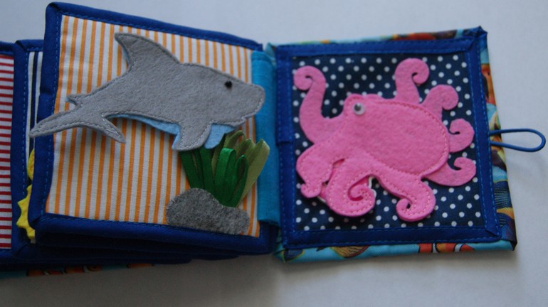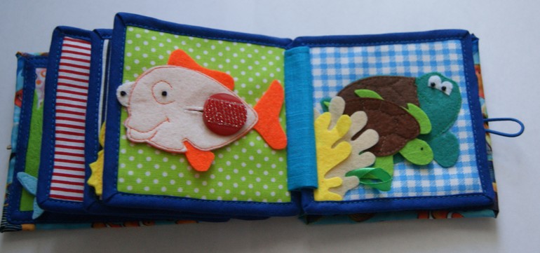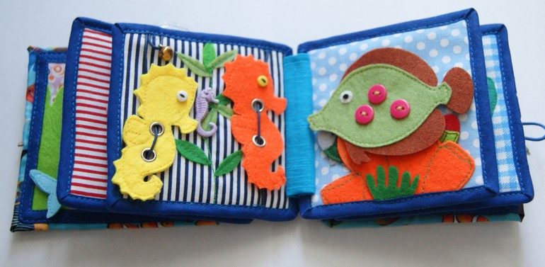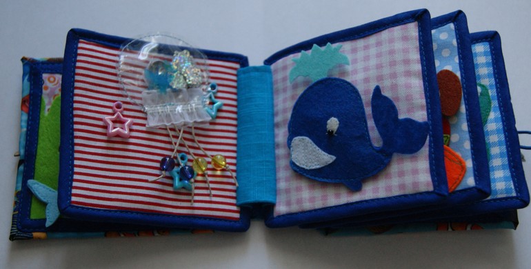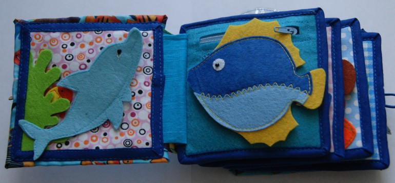 6 страница: море. Карман из фетра и сетки закрывается на молнию. Там спрятались от дельфина три рыбки. Там же натянут шнур с разными бусинами, которые можно перемещать, не открывая карман. Дельфин крепится на липучку и может по ней перемещаться влево-вправо. Персонажей можно поменять местами - рыбок поместить вверху страницы на липучку, а дельфина спрятать в карман. тоже попозже