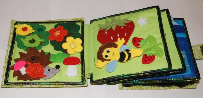 2 страница:клубника. под большой ягодой из кожзама спит пчелка. Пчелку нужно разбудить и найти ей место на странице. Она крепится на липучке на любом из цветков по усмотрению ребенка.