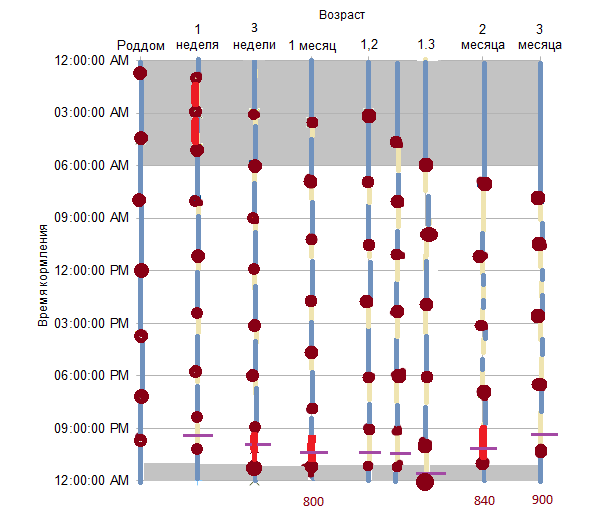 По вертикали - время, по горизонтали - возраст ребенка. Бордовые точки - кормления, желтые линии - бодрствование, синие линии - сон, красные линии - "часы плача", фиолетовая полосочка - ванна. Серый фон - ночное время суток. Цифры - количество смеси в сутки. Все конечно условно и примерно.