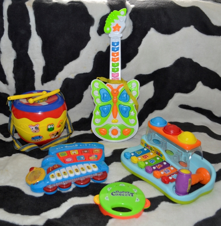 Это моя тяжелая артиллерия. Барабан классный: звуки издаваемые животными, музыка, светомузыка и кнопочки большие (здесь сын справляется) и очень мягкие - легко нажимать. Пианино в нескольких режимах: экзамен, музыка, игра+ опять звуки животных, цифры. По ксилофону тоже умеют стучать молоточком (и не только) и пытаются выдавить мячики (выдавливаешь - мячик ударяется о ксилофон и звякает) - дети счастливы. Гитара тоже с несколькими режимами, надолго удерживает внимание.