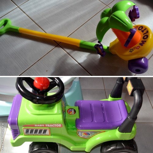 Каталкой играют, катают. Ручку я снимаю для возможности катать из положения сидя (есть вторая, но достану позже, на смену). С трактором познакомились только сегодня (восторг полный). Покатала обоих (еще, конечно, рано и маленькие они), но сын пытается встать и на коленях ходит за все держась. Будет ему опорой. Купили две машины (розовая в кладовку пошла) -площадь не позволяет.