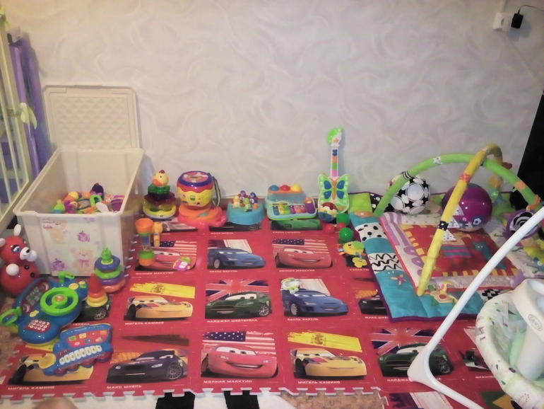 Так выглядит наша игровая зона. Игрушки я меняю раз в 2-3 недели. Крупные не лежат там постоянно, "выдаю" ежедневно.