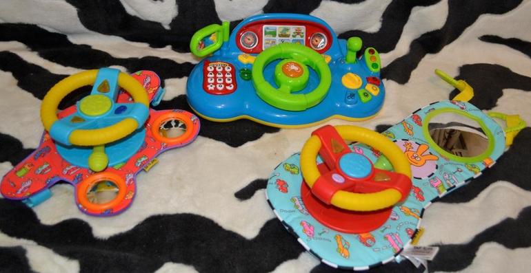 Все, что касается машин, рулей - это моим очень интересно. У нас два руля на коляску и в машину и голубой Говорящий руль - очень нравится, хоть и не по возрасту, но дети научились его катать (он на колесах и спереди в виде машины) и на нем же дочь научилась нажимать кнопочки (сын пока такие маленькие не осилил).