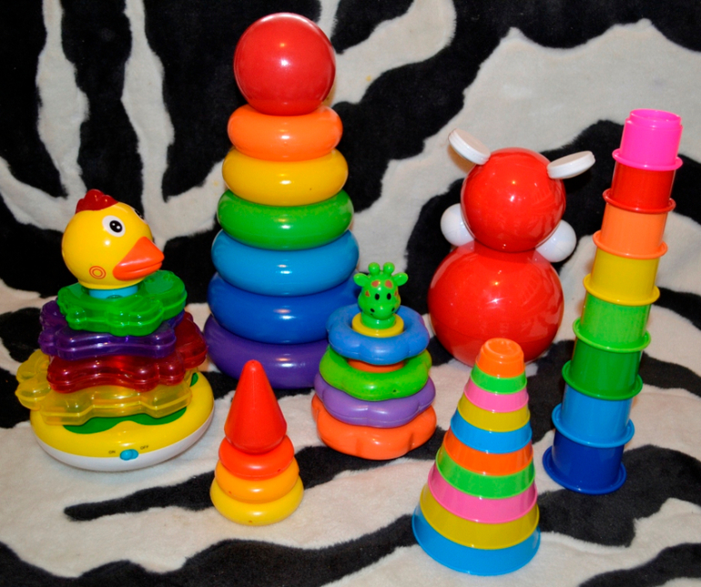 Очень нравятся пирамиды все, кроме погремушки-петушка. Он им очень интересен, но только посмотреть (музыкальный, переливается, кукарекает, издает всякие звуки), а колечки очень громко гремят и дети пугаются, хотя месяцев в 5 были в восторге от нее. Может в дальнейшем будут играть. Втулочки у них в особенном почете (две правые пирамиды) я строю-они ломают и визжат от радости.