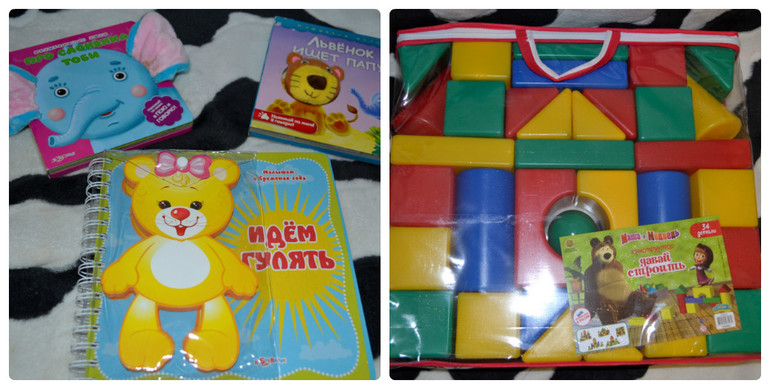 Книги еще не понимают, но я упорно читаю. Конструктор очень нравится, тоже ломать то, что построили, стучать кубик о кубик. Брала самый простой, чтоб формы различные были, 4 базовых цвета и безопасный для малыша (лего для малышей нам подарили, пока лежит в кладовке). Еще у нас есть кубики-мякиши (в стирку пошли), тоже играют с удовольствием.