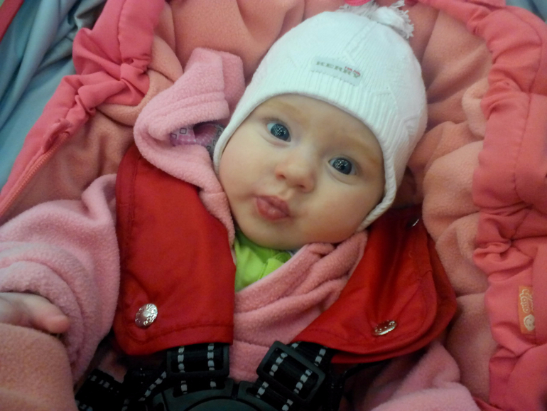 Очень любит общаться, едем в автобусе, так она со всеми начинает в прядки играть и улыбка не сходит. Социальность развиваем постоянно. Я заканчиваю универ, так как оставить не с кем, все работают по 66 дней в неделю, то Майя всегда со мной.