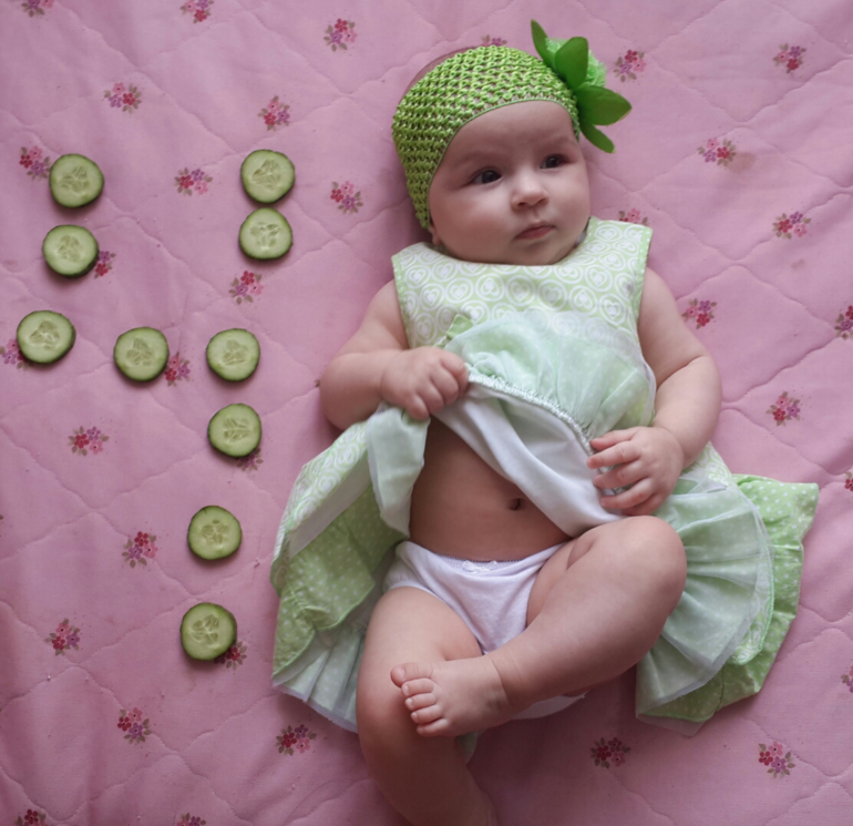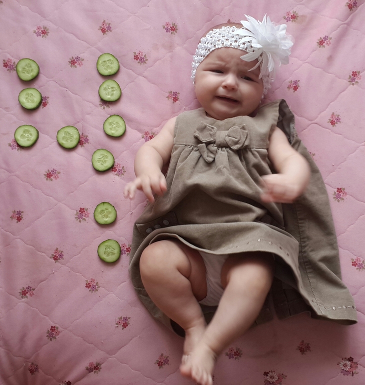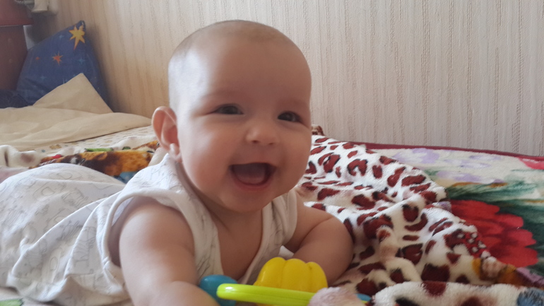Викуля уже совсем подросла.Разговаривает во всю.Улыбается маме целый день.А вот незнакомым не сразу.Сначало приглядится.Ручки всегда вытянуты вперёд.Нужно всех и всё пощупать.Хватает за лицо маму,гладит.Игрушки хватает хорошо-сосёт и перелаживает в другую ручку.Есть попытки ползти,ножку под себя подтягивает.А если ладошку подставить,то ползёт на животе.