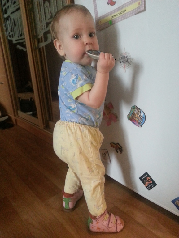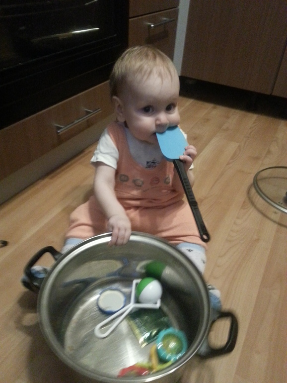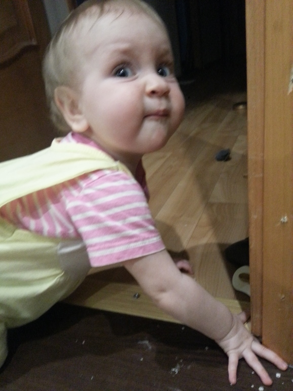 Умелки. Научилась перелистывать страницы книги - теперь, читаем книгу, только этим и занимается. Научилась приседать на корточки, чтобы поднять предмет с пола. Правда в ботинках неудобно - только босиком. Научилась сама хлопать в ладоши. Стала складывать игрушки в коробки/судочки и т.д. Пытается собрать пирамидку. Любит все вынимать из емкости и рассматривать. Этим мы занимаемся на кухне, пока мама готовит/кушает/убирает.