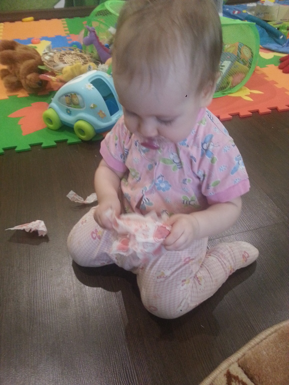 Еще недавно прочитала одну игру для малышей - завернуть у нее на глазах игрушку в салфетку и дать разворачивать. Игрушка нас совсем не впечатлила, а вот салфетку рвать очень понравилось.