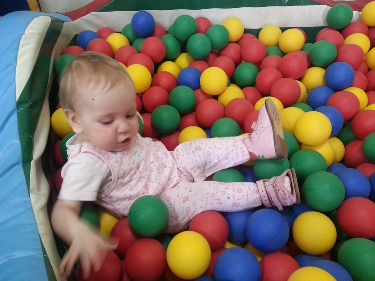 Потом ползали и ходили по дорожкам. Аня даже простояла без опоры впервые 10 секунд. Она вообще боится отпускать опору, но тут отвлеклась на мальчика.