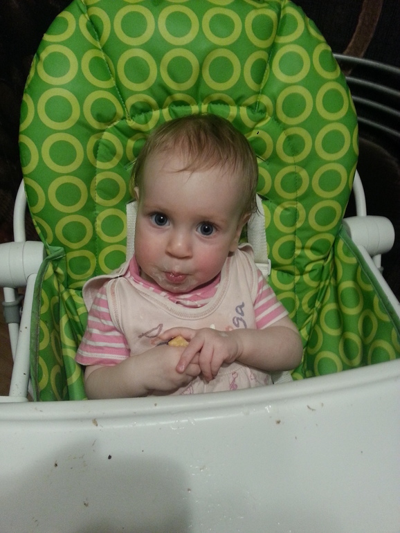 Еда. Едим все хорошо. Завтрак - каша. Завариваю ей обычные безмолочные каши на воде пополам с молоком. Обед - супчик из мяса с овощами. Недавно попробовали белокочанную капусту. Ещена обед иногда даю рыбку с овощным пюре или печень с овощным пюре. Полдник - грудь. Ужин - творог/кефир/йогурт и печенька. Печеньки любит - научилась на них жевать.
