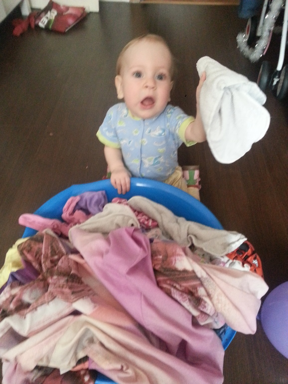 И помогаем маме вешать белье сушится. Аня достает его из тазика и отдает мне на просьбу "дай"