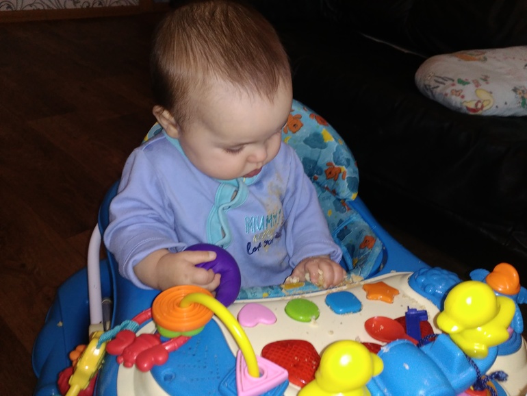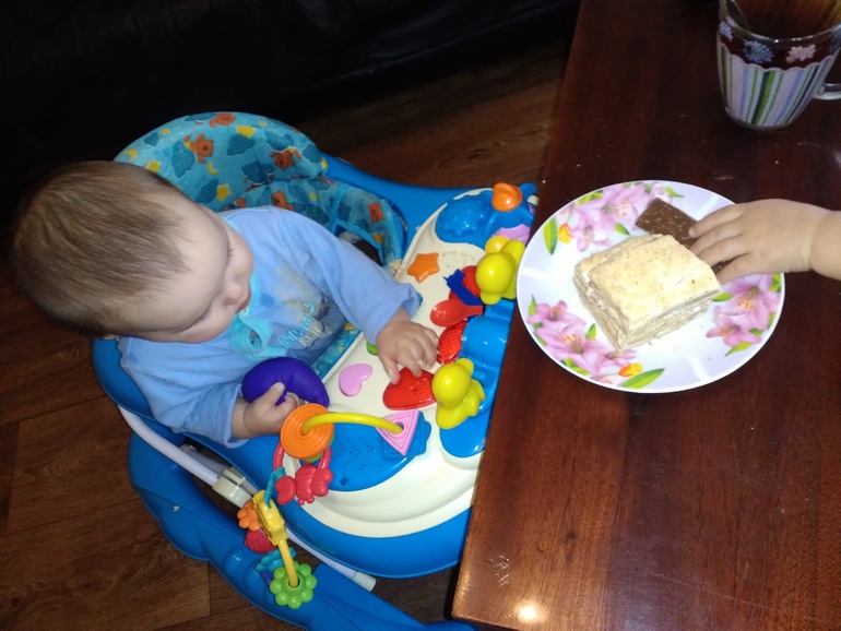 В ходунках тоже подъезжает ко всему,что можно схватить и тащит быстренько(так один раз оставила я нам жур.столике кусочек наполеона на тарелке и кусок шоколадки,а сама пошла за чаем на кухню, 1-2 мин-выхожу значит,Сева уже ухватил кусок шоколада, а Ярослав стащил тарелку с тортом себе в ходунки, отщипнул кусочек торта и бегом в рот тащит))как я смеялась))засняла даже этот момент!!!![]()