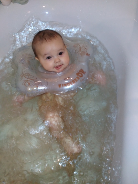 Купаемся мы уже без круга в ванной,т.к. Ярослав сильно начал в нем крутится и переворачиваться чуть ли не головой вниз, и много брызгался-все вокруг мокрое было.![]()
