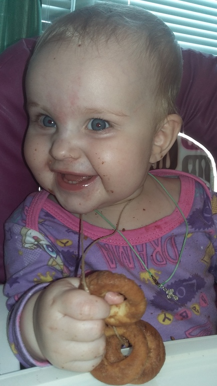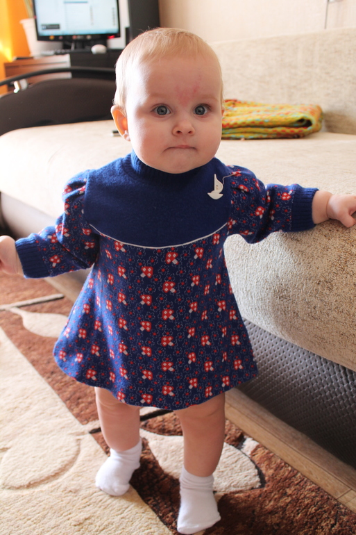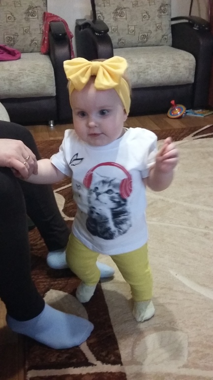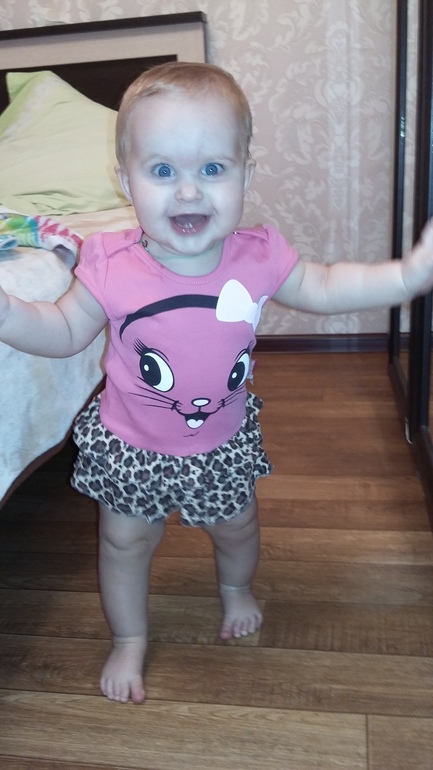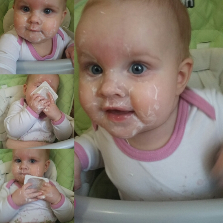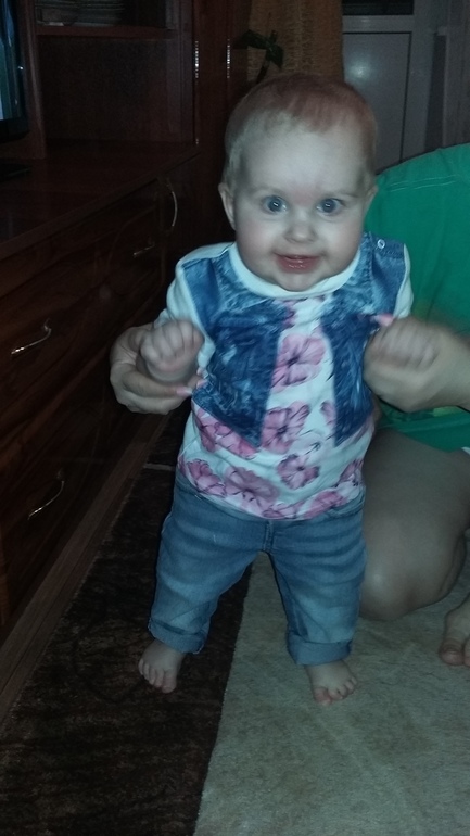 Дни летят со скоростью света! Еще помню, как переживала, потому что Варюша не хотела переворачиваться, а теперь мы уже делаем целых семь шагов без опоры)))) Вообще дочка очень шустрая, все ей надо, везде надо залезть. Любимыми игрушками остаются телефоны, шнуры, пульты. Прям как шоколадом намазаны. Папе один телефон уже заслюнявили до смерти....вроде и не даем, а стоит отвернуться уже что то нашла))) Рост у нас уже выше нормы как нам говорят, 74 см, родились мы 52 см. Тьфу тьфу вес стал нормой. Пока активно не начала двигаться каждый месяц набирала по килограмму. С семи месяцев как встала и научилась ползать как метеор вес прибавился за 2 месяца на 100 грамм, теперь 9400 весим))) Кушаем мы нормально, иногда даю ей волю творчеству, получается вот так: