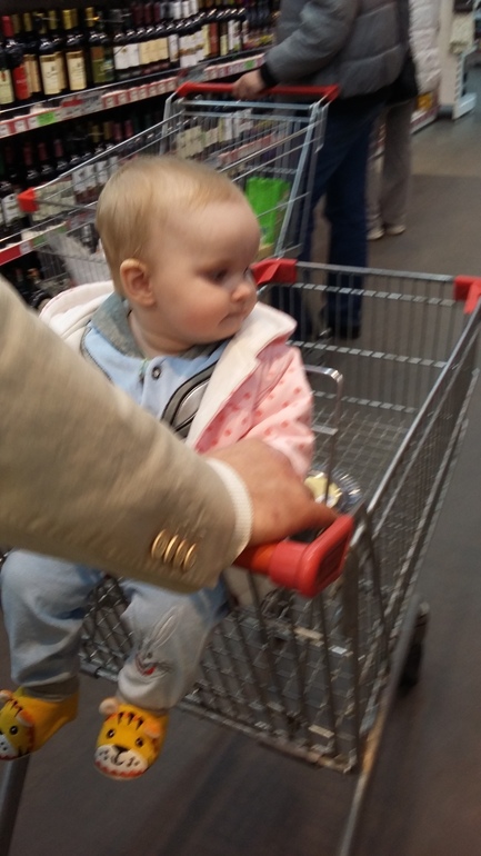 Когда приезжал папа был первый выход в магазин, сидела ко всему ручки тянула