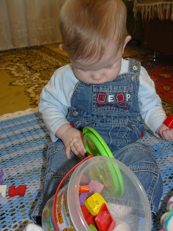 Пацан он у нас я б не сказала, что спокойный, но усидчивый. Его на долго могут заинтересовать игрушки. Проявляет интерес всему что предложишь, но любимой нет. Нравиться очень играть кубиками с Дианкой, она ему башенки строит, а он валяет, и такой же довольный при этом!