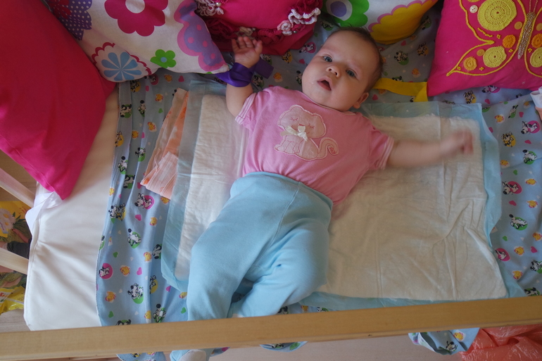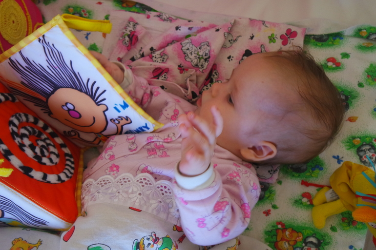 Люда часто поворачивается ногами к подушке, иногда выкидывает ножки за борт кроватки.