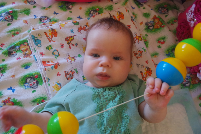 Милочка очень любит тусовку. В кроватке играет, если сестры тоже в детской.