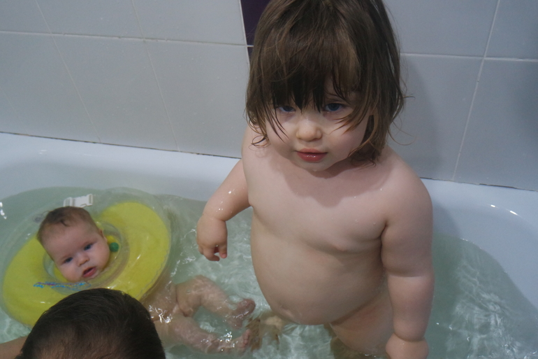 Плавание перед сном.Лиза всегда веселит Милочку: щекочет щечки и пяточки, делает волны, запускает рыбок и уток.