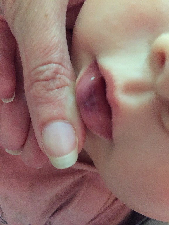 Может губу засосала сильно, ну втянула в себя, либо зубы полезли и она деснами прикусила.