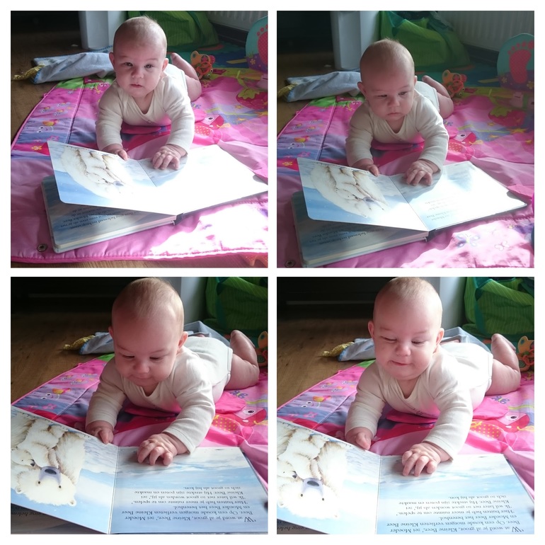 - На животе хорошо держит голову, не устает уже. Берет игрушки двумя руками, обсасывает. Машет руками и ногами - пытается ползти.