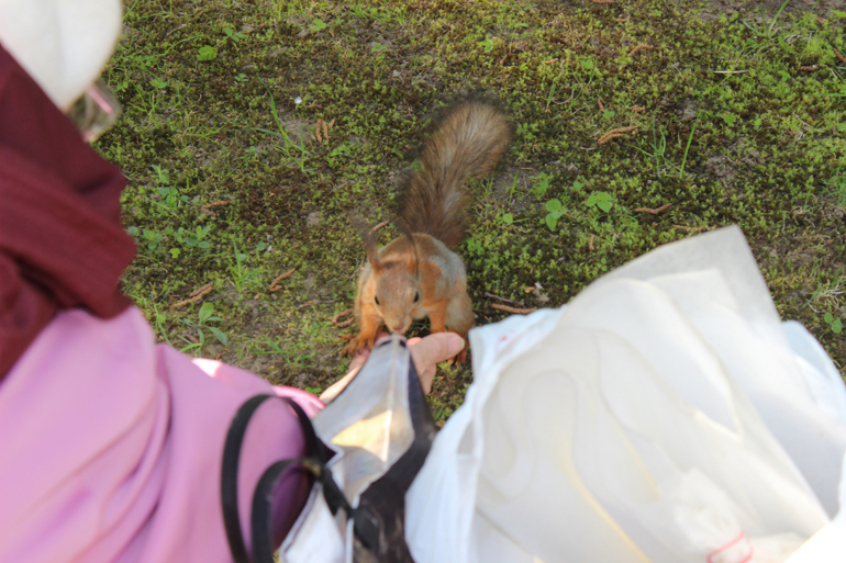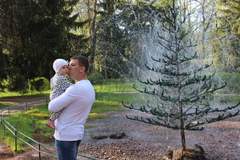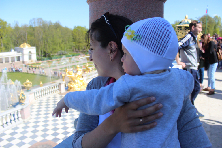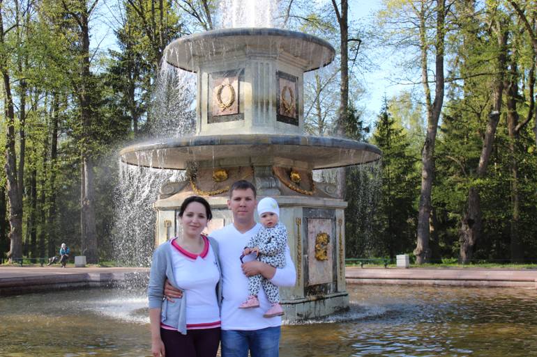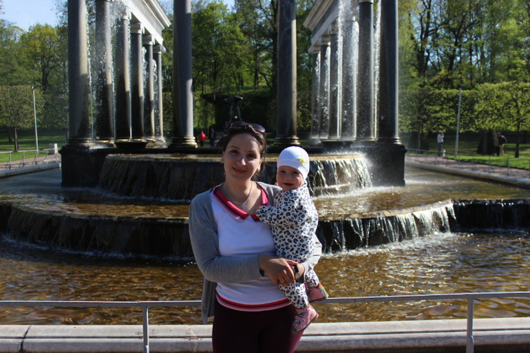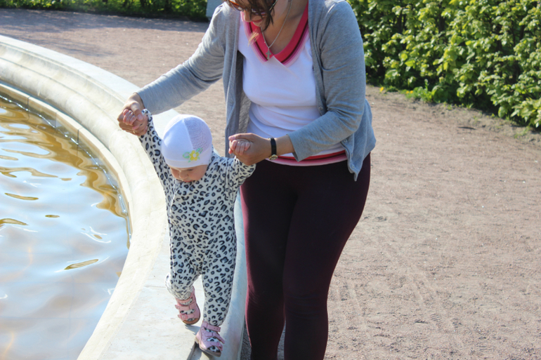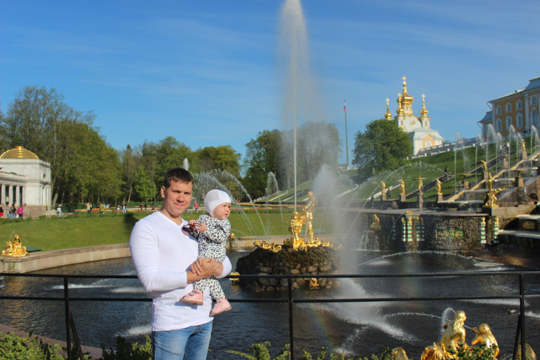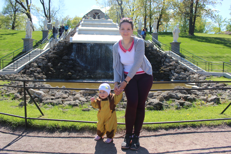 На прогулкеУ мужа отпуск, поэтому решили куда-нибудь свозить Анюту. Пока погода хорошая поехали в Петергоф.