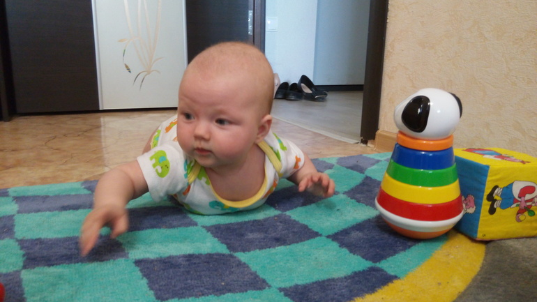Ползать мы хотим еще со времен,когда учились держать голову.Сейчас у нас это, можно сказать, начинает получаться. Хотя конечно я еще та мамаша.Только сегодня узнала,что детишки по идее сначала ползут,а потом садятся сами.А я жду когда сядет,а потом поползет)