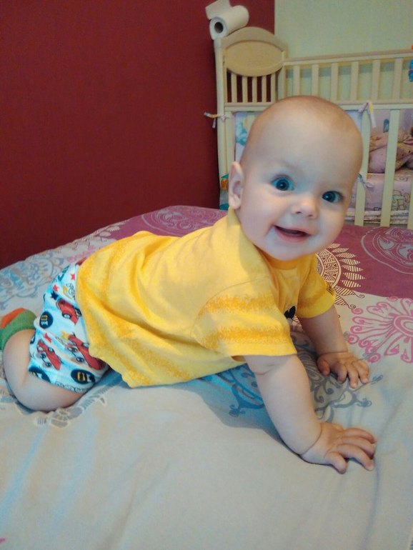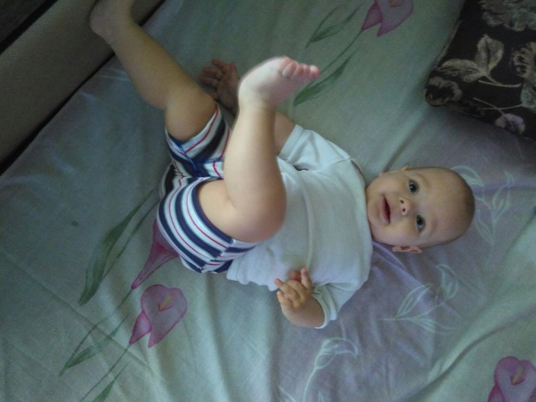 Всё также ползает назад, но научился делать стойку и сидеть как лягушка, пытаясь оттолкнутся вперед. А когда получается, пищит от радости)