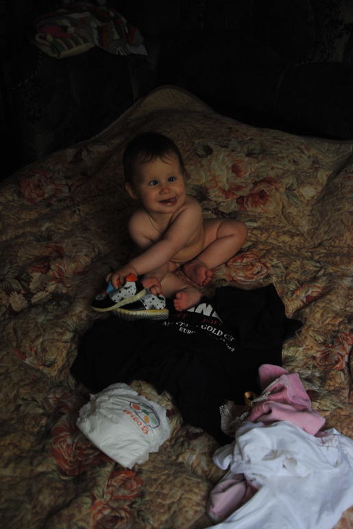 Еще у ребенка режим "По улицам ходила веселая Годзилла" - мама строит дома, Полина их рушит)) Все надо стащить на пол, там бросить и потерять к брошенному интерес моментально. В доме перманентный бардак, а вкупе с переездом это выглядить феерично)) А вот так ребенок приносит маме игрушки и колготки)))