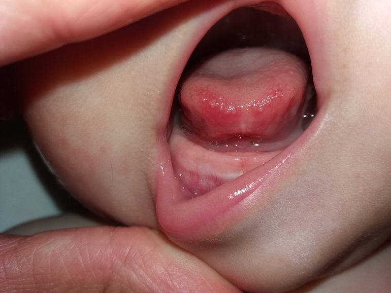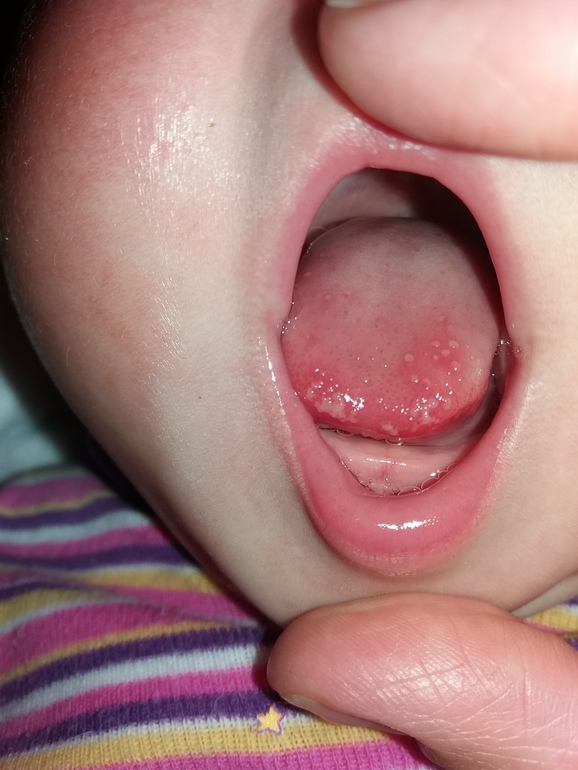 За сутки я еще ничего не предпринимала, никаких лекарств не покупала, ротик ничем не протирала. А вид язычка немного меняться. Посмотрите вообще что это и может само пройдет?