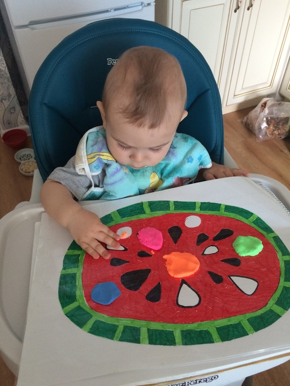 Сын долго ковырял пальчиком семечку и красную серединку! Что-то получалось отковырять, что-то нет. Ручки протерла влажной салфеткой и все чисто! В этот раз разместились на полу - больше свободы у малыша.