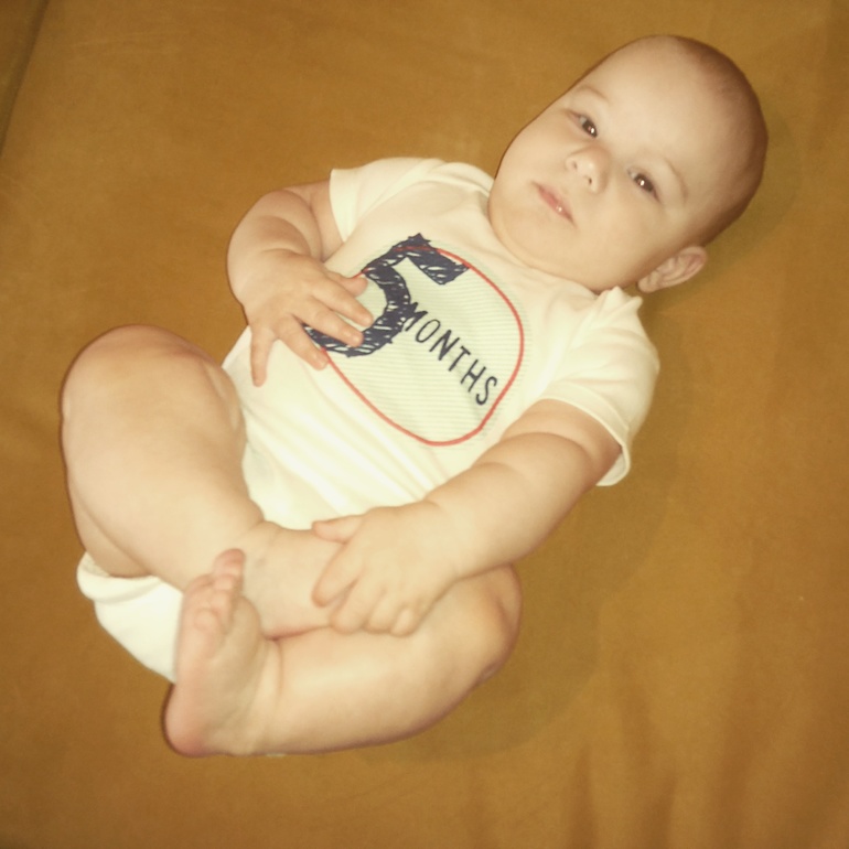 - И как-то сразу в то же время он стал гораздо более активным и на животике, и на спинке. Пытается ползать активно, пока только меняет направление ползанья и отползает назад - но не специально, и не вставая на коленочки, а просто упорно дрыгая ногами по-разному. То что ползет в противоположном направлении, чем хотелось бы, его конечно расстраивает)