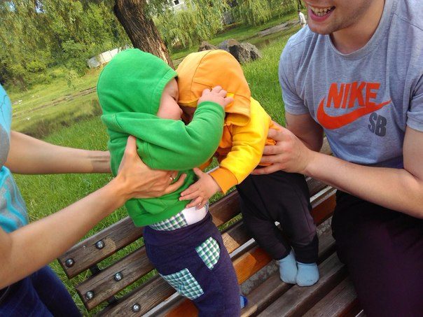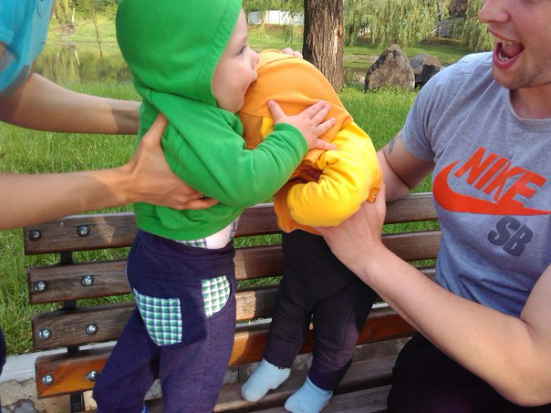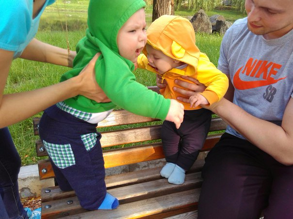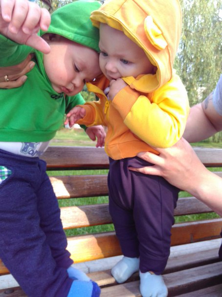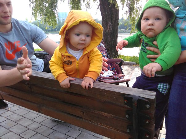 Посадили рядом, тот парень оказался активнее, в плане знакомства, чем Дамир. Мой кроха сидел и спокойно наблюдал за поведением друга) Даже получил по уху! И крик на пару сек! Чуть позже они начали обниматься и целоваться, а как домой ехать, так вообще "печальбеда" была - не хотел друг Степа разлучаться с Дамиром)