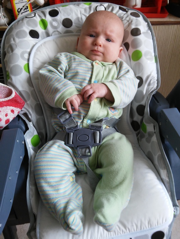 Лежать не любит, носи его, все показывай. Улыбается всем и себе в зеркале. Стал так прикольно смеяться, когда его тормошишь. Хочет сидеть, на ногах пытается стоять. Уже иногда в стульчике делаю положение полусидя, естественно чередуя с положением лежа, иначе дома сделать ничего нельзя, так и тягаю его за собой повсюду.