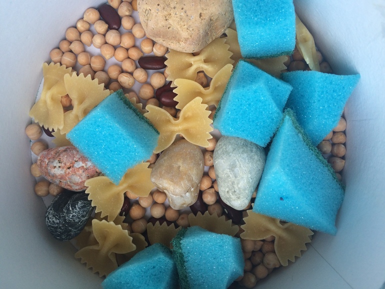 Состав: нут, макароны бантики, камни морские=), губка, фасоль.