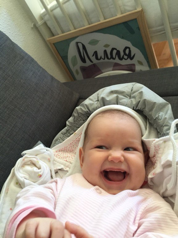 Что умеет: событие месяца - это перевороты со спины на живот (спасибо, массаж!). В общем, превратилась в юлу, очень старается и всегда крайне довольной выглядит, перевернувшись. Пытается ползти, активно поднимает попу и шевелит ножками. Все это сопровождается нереальным количеством звуков. Они стали самыми разнообразными: отчетливо произносит слоги с "м", когда остается одна, даже произносит что-то похожее на жалобное "ма-ма" - и это забавно: еще не зная, что такое "мама", они постепенно соотносят произнесенное с объектом, потому что ведь мама тут же влетает в комнату:) Недели две активно использовала силу крика) Я даже гуглила что-то вроде "ребенок кричит, как птица" - мне сразу выдались похожие запросы, и мамы сравнивали этот крик с "воплем бешеной чайки". Мне это сравнение очень понравилось, настолько оно точное:)