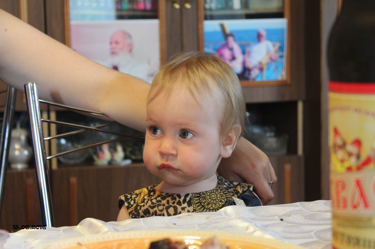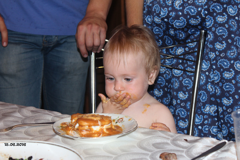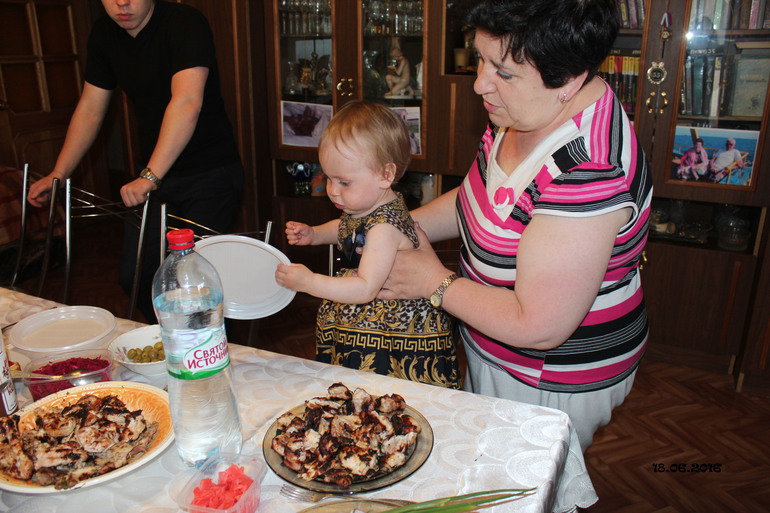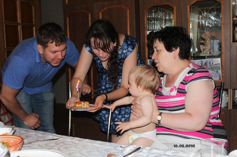 Собрались в доме моих родителей за час до Аниного сна. Пока бабушки сидели с Анютой, дедушка гулял с внуком, остальные готовили. Положили Аню спать, а сами сели за стол. Жарили шашлыки и варили уху на костре. Когда Аня проснулась, присоединилась к нам. Потом пошел дождь и мы перебрались домой. Анюту задарили подарками и вниманием. К вечеру она получила еще тортик. В общем, день рождения удался.