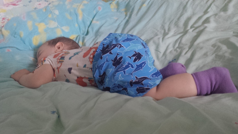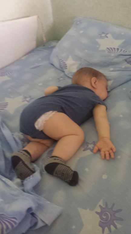 У меня ребенок в основном спит на спине или на боку,на животе полусонный пытается ползти,поэтому я его стараюсь перевернуть