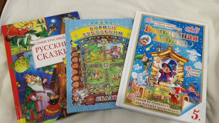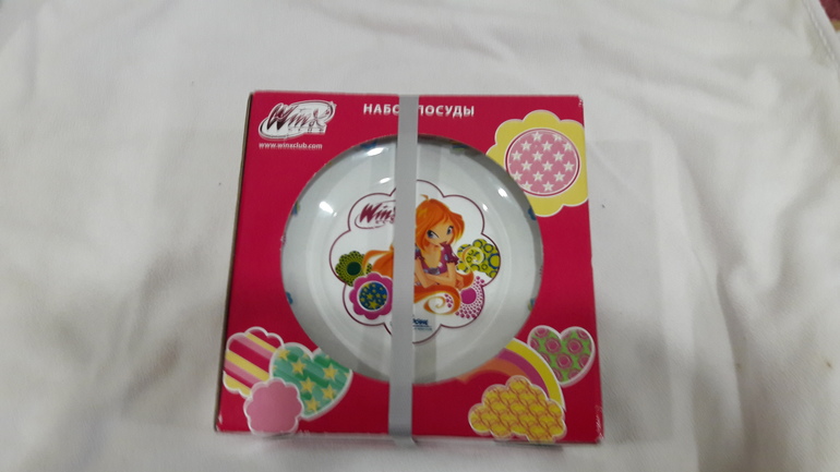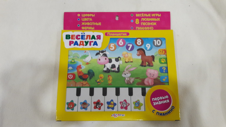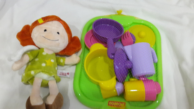 Игрушки - мягкий ангелочек и набор посуды. Посуда очень нравится - играет с ней много, особенно нравятся вилки/ложки и кастрюля со сковородой