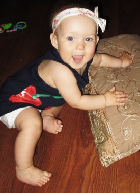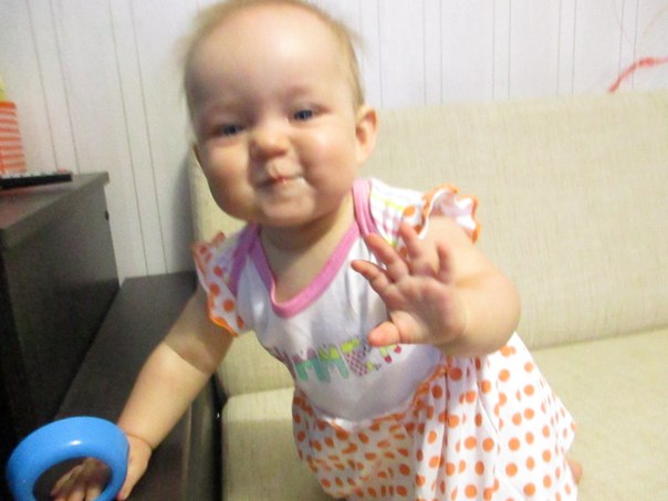 Из умелок - месяц наипродуктивнейший. За этот месяц научилась: сидеть, садиться, вставать у опоры, ходить (чуточку) за руки и вдоль опоры. Ползает пока как солдат раненый, но иногда и четвереньки проскальзывают.