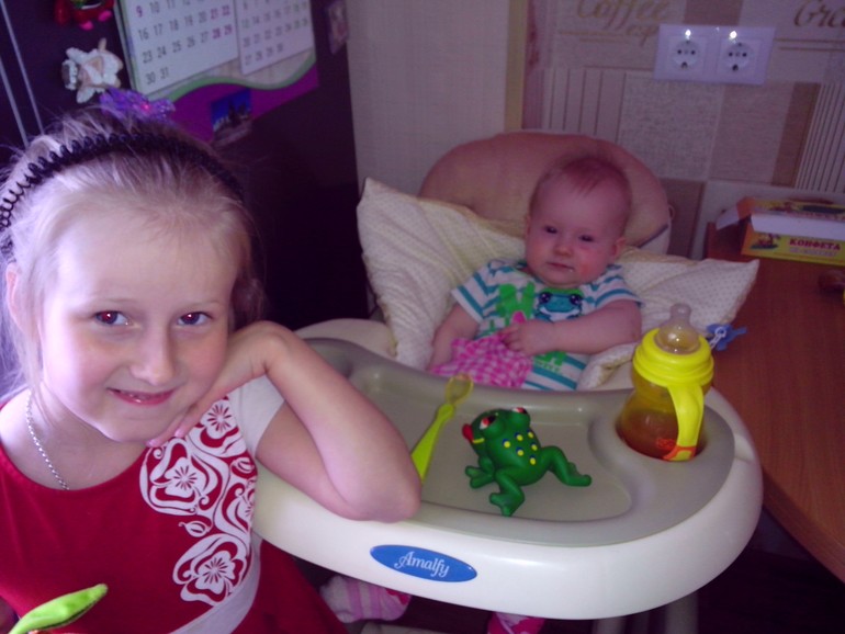 ЗнакомимсяЭто наша любимая поза.Я так понимаю оно ей заменяет сидячее положение,потому как по другому она садится не хочет.ну и за одно к полугодию имеем: прорезавшийся вчера зуб,(да та самая ямка все таки была началом нашего зуба),становимся на четвереньки и качаемся,прыгаем как лягушка(это вместо ползания)и все это скопом привалилов первую неделю стукнувшего полугодия,насыщененько как то получилось.хватаем все что плохо и хорошо лежит,ну и все по возрасту,претензий к нам у врачей нет.весим в 6 мес 7600 рост 66,5.