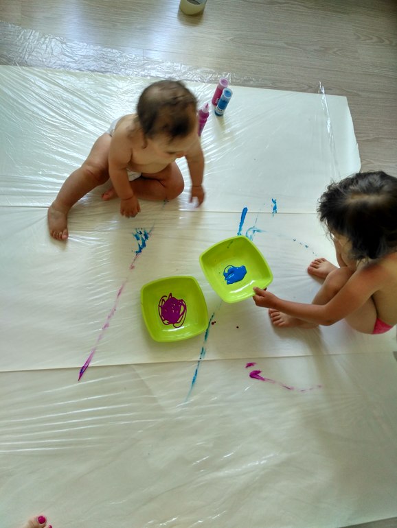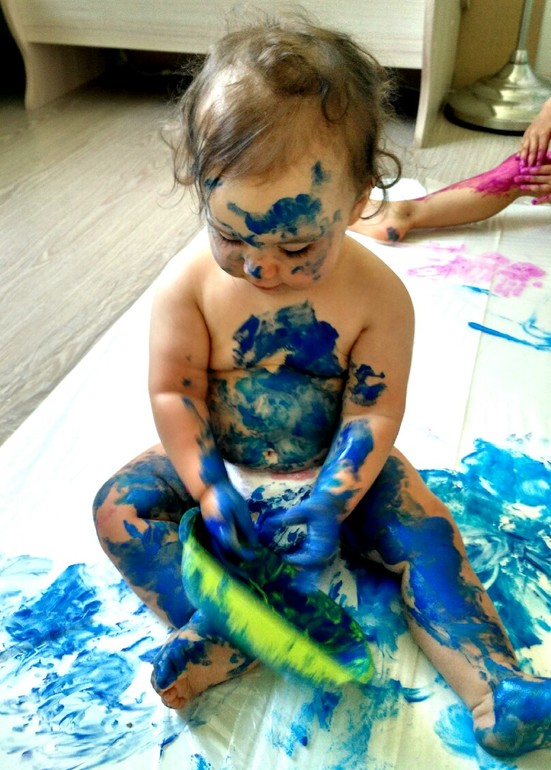 Началось все более чем спокойно, я разграничила для каждой свою зону и села в сторонке наблюдать. Маруся ничего не боясь, стала вертеть тарелку в руках, потом окунать в нее свои пухлые пальчии, ну а затем скромно пыталась хлопать ладонями по полу. Однако больше всего ей понравилось само ощущение скользкой краски на ладонях и она еще долго поглаживала и жамкала ручки между собой. А потом кто-то из нас что-то сказал, а может просто события так сложились, и Маруся сделала вот так