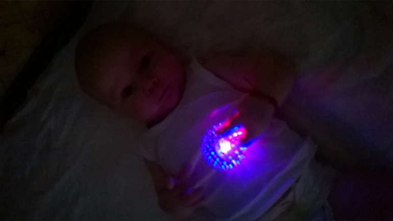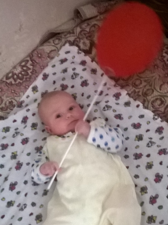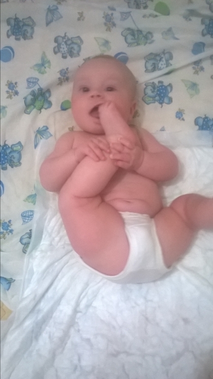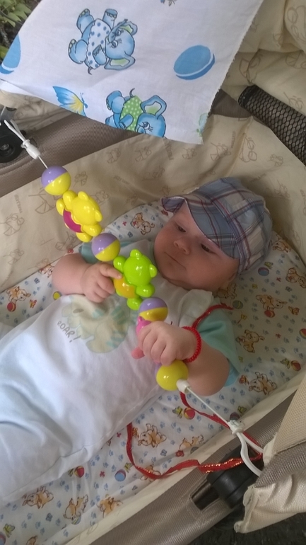Едим мы по-прежнему только мамино молочко. В сильно жаркие дни даю чуть водички с ложечки. А так кушается у нас уже ВСЕ! И пеленки, и одежда и памперсы и игрушки, руки и не только свои и ...уже и ноги! Добрался до них) Даю прорезыватель, грызет прям смачно так, но самый любимый у нас зайка резиновый