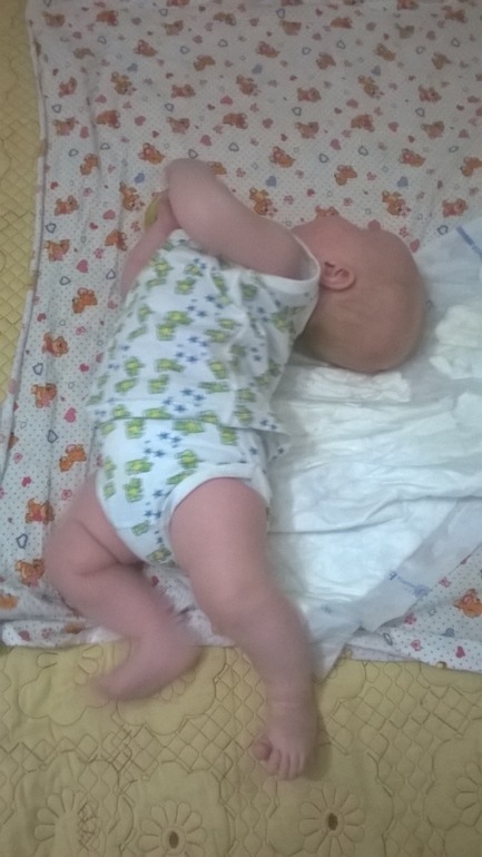 Хорошо переворачивается на бочок, со спины на живот перевернулся наверно раз 6 за последний 2 недели. С живота на спину еще не может. Все не поймет куда ему девать руки. Зато сидя в жезлонге продолжает активно качать пресс)))Хочет сидеть) К слову сказать развитие идет своим чередом, мы делаем сами легкую зарядку и массажик, без профессионалов. Всему свое время)