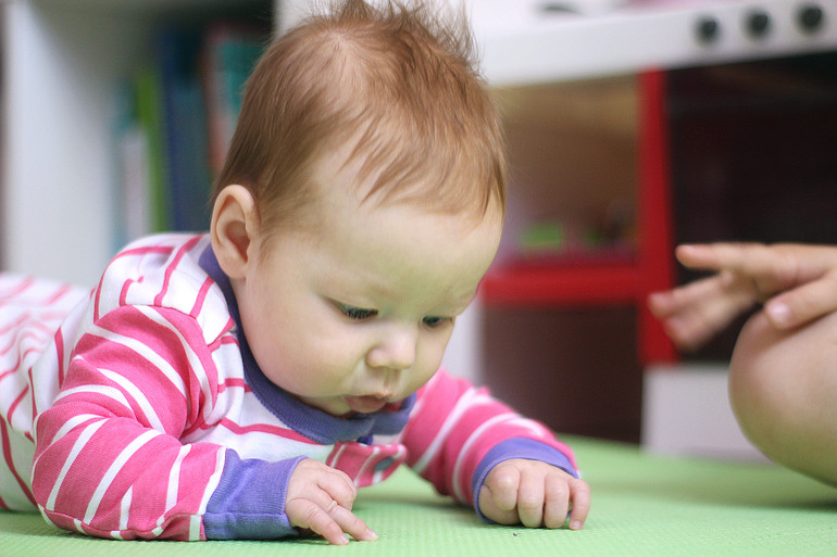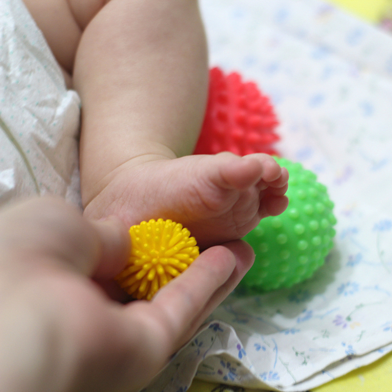 На ощупывание у нас завелась коробочка с тканями. Пока пальцы неловкие, проводим сами по ладошке и по стопам заодно разными текстурами - шерсть, мех, хлопок, мешковина, шелк. Чуть позднее малыш и сам будет их с радостью мять и сжимать в кулачки.